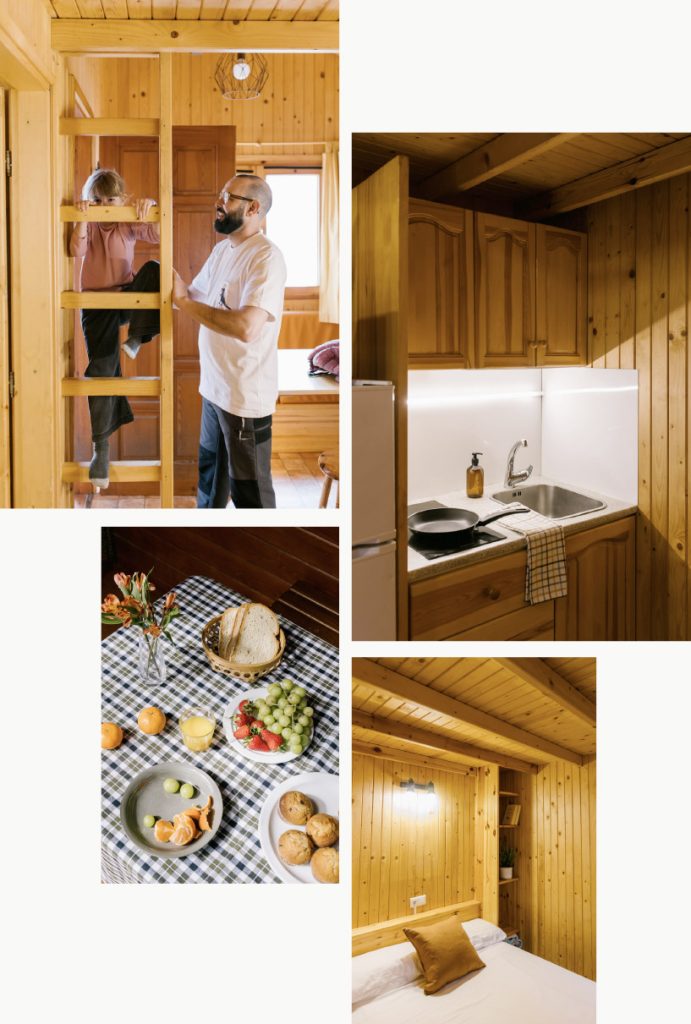 Casita de madera para 4 personas totalmente equipada con una terraza exterior. Tiene dos plantas, en la planta inferior hay una habitación de matrimonio, un baño con ducha y una cocina comedor. A través de una escalera vertical se accede a la planta superior o altillo, donde hay una habitación con dos camas individuales.