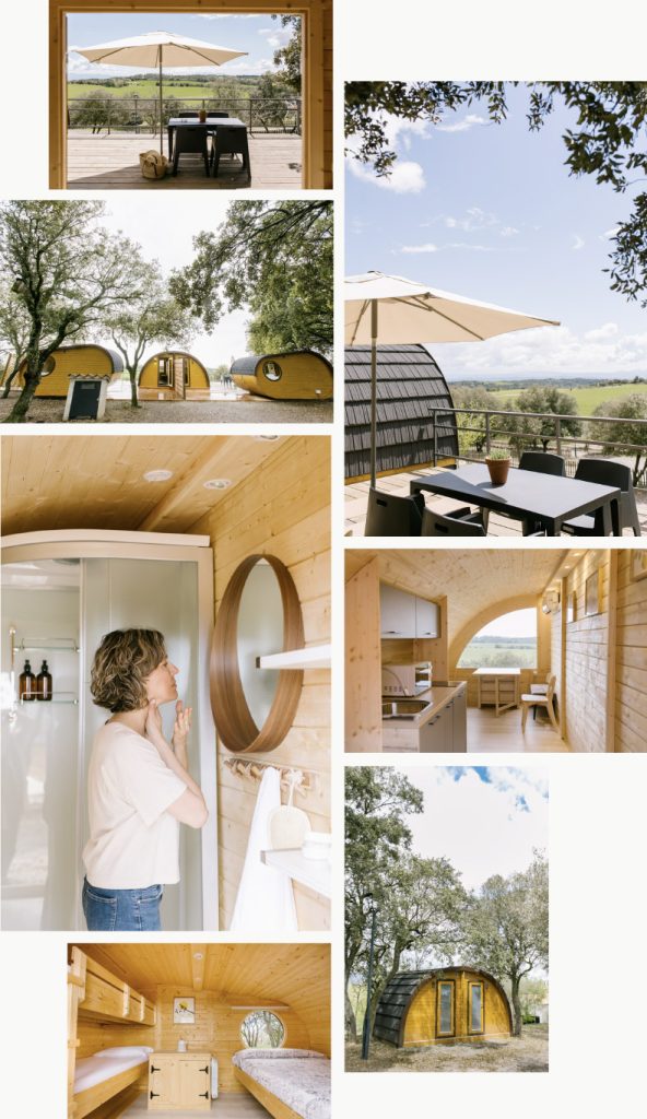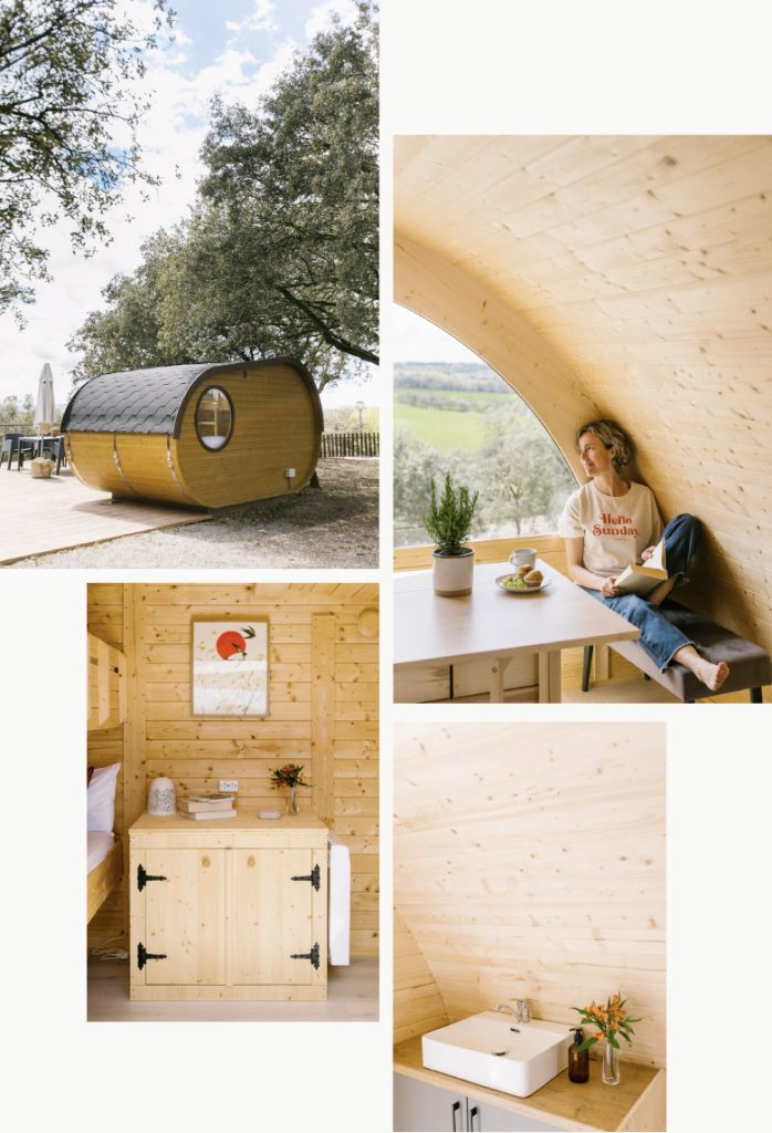 Los pods son pequeñas cabañas de madera de pino nórdico macizo con forma ovalada, inspirada en construcciones tradicionales del norte de Europa.